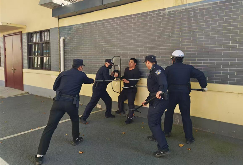 随着演练指令下达,模拟警情正式展开。面对“突发情况”,校园警卫队迅速启动应急响应机制。队员们反应敏捷、行动迅速,按照保卫处安全稳定突发事件应急预案,熟练运用警棍、盾牌、防暴叉等器械,分工明确、协同作战,成功对“可疑分子”进行了有效阻拦与控制。整个演练过程环环相扣,紧张逼真,充分展现了我校警卫队员过硬的业务素质和良好的精神风貌。