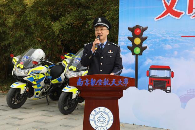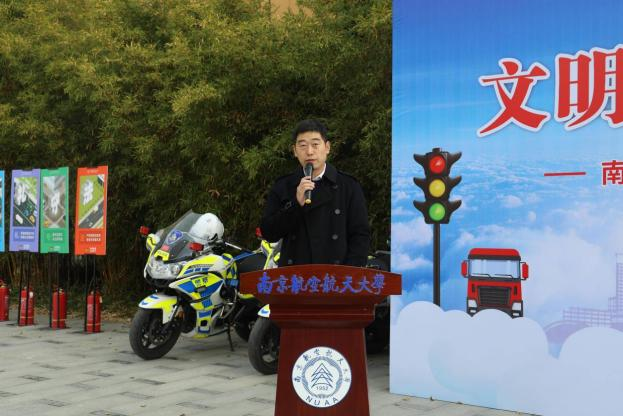 南京航空航天大学保卫处副处长袁琪代表学校致辞。他首先向溧阳市公安系统长期以来对校区安全稳定工作的大力支持表示衷心感谢。袁琪对文明交通的内涵进行了深入的解读,文明交通是一种“宽厚仁爱”的人文修养、是一种“格物致知”的科学实践、更是一种“守护未来”的责任担当,呼吁师生以今日为起点,不仅要做文明交通的模范,更要做校园交通安全文化的倡导者和监督员。
